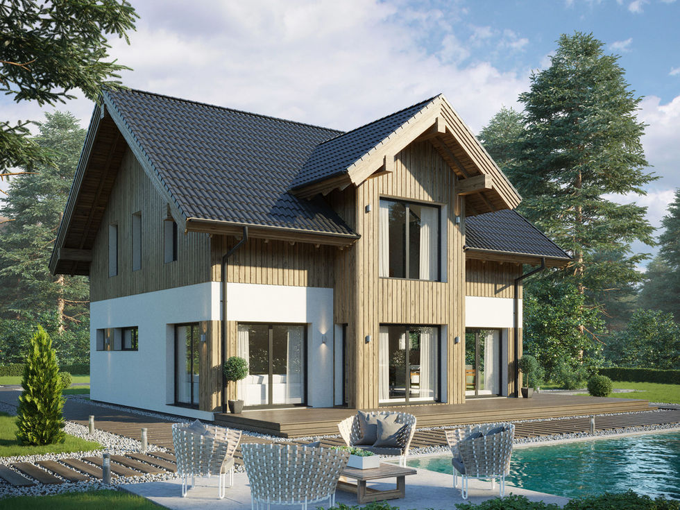 Auf zwei Etagen bietet dieses Haus ein offenes, lichtdurchflutetes Zuhause für Familien. Die Kombination aus Holzfassade und modernen Akzenten schafft eine harmonische Verbindung von Natur und Design.